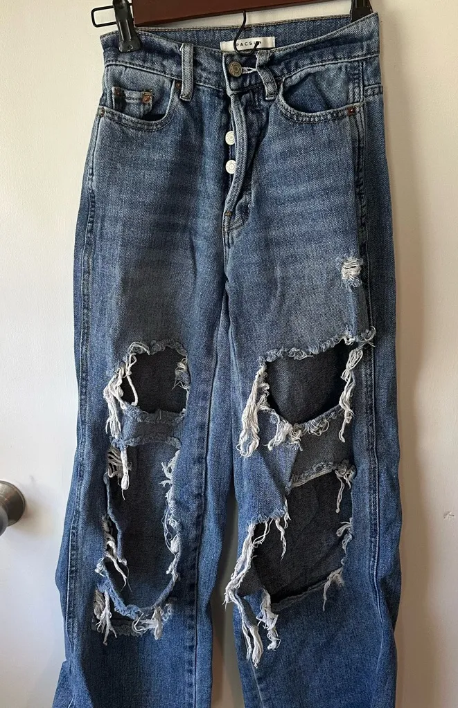 Edgy wide leg jeans with heavy rips. Classic blue shade. Ideal for a bold look.