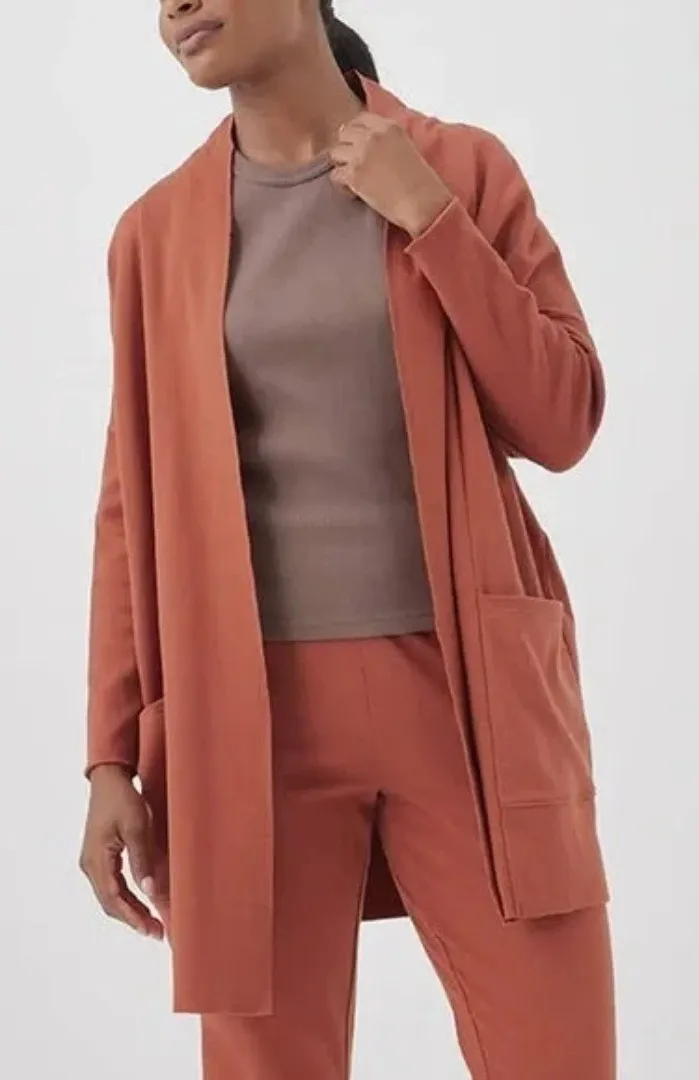 Soft, drapey open-front cardigan crafted from Pact's signature organic cotton, designed with a relaxed silhouette that layers effortlessly. Features a shawl-style draped collar, hidden on-seam pockets, long sleeves with ribbed cuffs, and a center back seam for subtle structure. Extra-long length makes it an easy throw-on for comfort-forward styling at home or on the go. Condition: Excellent pre-owned. Smoke-free, pet-friendly home. Ships in 1–2 days ✨ Color: Baked Clay Orange Size: XS/S Pit-to-pit: 26" Length: 32" Keywords: travel, lounge, weekend, casual, cozy, sustainable, organic, layering, relaxed, comfort, minimalist, capsule, winter, fall, spring, mountains, non toxic, eco-friendly