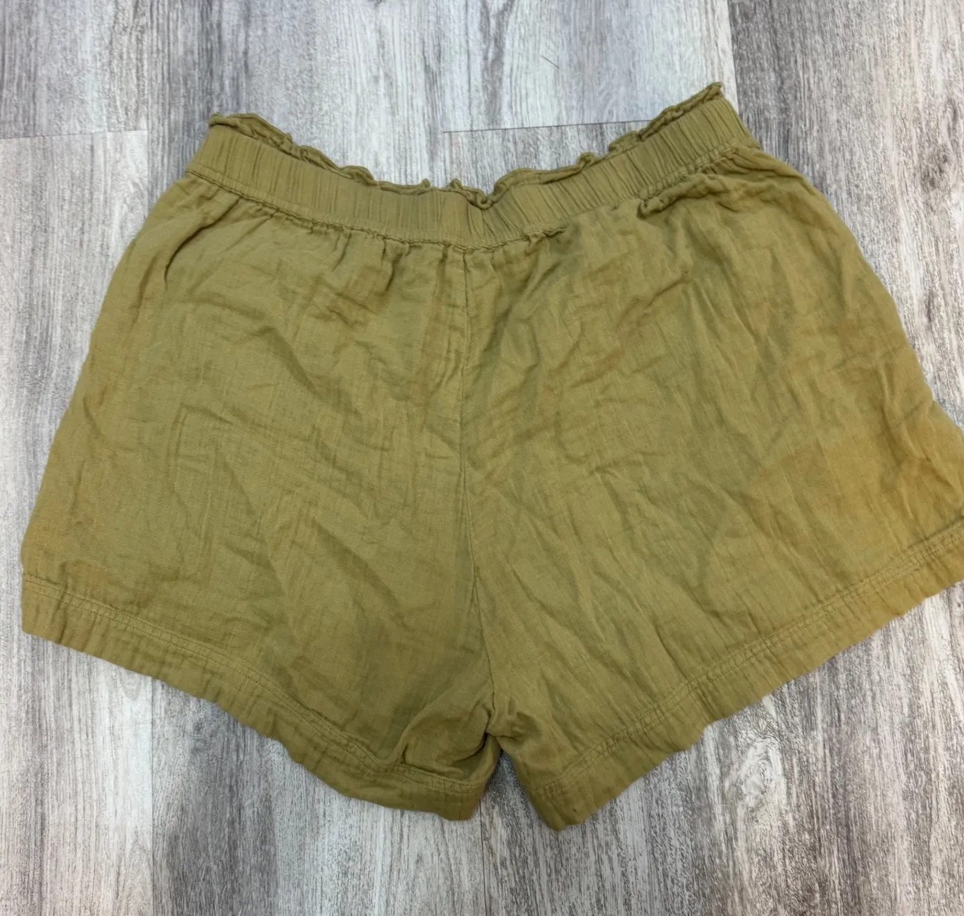 Pact organic cotton shorts with a relaxed fit. These shorts feature a comfortable elastic waistband with a slight ruffle detail, two side pockets, and a flattering hemline. Crafted for breathability and comfort, they offer a casual yet stylish option for everyday wear. Measurements: • Waist: 16 inches • Inseam: 4 inches Style: Paperbag Department: Women Fabric Type: Muslin Material: 100% Cotton Theme: Casual, Summer Occasion: Casual Accents: Ruffle Pattern: Solid Features: Elastic Waist, Pockets, Breathable, Lightweight, Comfort Performance/Activity: Beach Fit: Relaxed Keywords: Pact shorts, organic cotton shorts, paperbag waist shorts, linen blend shorts, women's shorts, olive green shorts, casual shorts, summer shorts, relaxed fit shorts, comfortable shorts, high waist shorts, plus size shorts, XL shorts