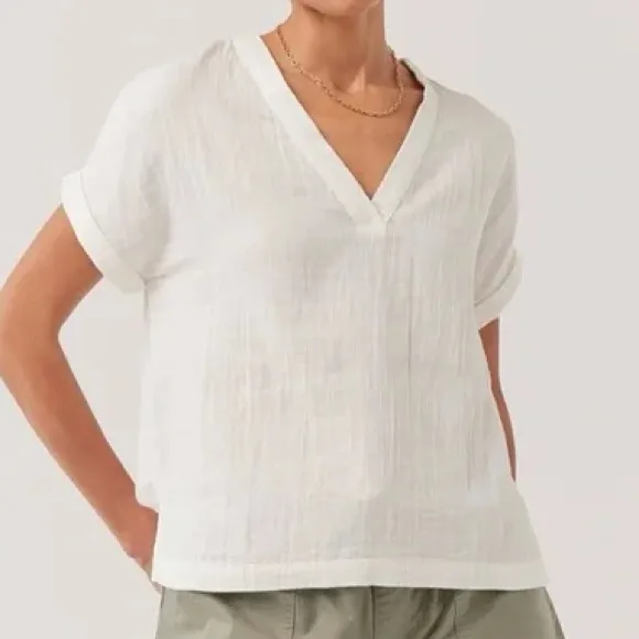 Very good used condition. Has been worn and washed. No flaws. Measurements when laying flat Pit to pit 26” Top hem to bottom (measured from center back neck to bottom) 26” The perfect top for your next getaway or your everyday. Designed for throw-on-and-go moments, this versatile Short Sleeve Popover elicits the ease of being on vacation - even if you never leave home. Made with a woven, organic cotton double-gauze fabric that feels flowy, lightweight, and is designed to hide wrinkles for easy travel. Machine washable 100% Organic Cotton Pact organic cotton top, coastal gauze popover, double gauze short sleeve popover top, v neck casual blouse, lightweight breathable top, sustainable eco friendly clothing, ethically made women’s top, relaxed fit summer top, beach coastal style, minimalist capsule wardrobe, casual everyday blouse, soft textured cotton top, vacation resort cruise wear, spring summer top, women’s organic cotton blouse, size XL XXL top