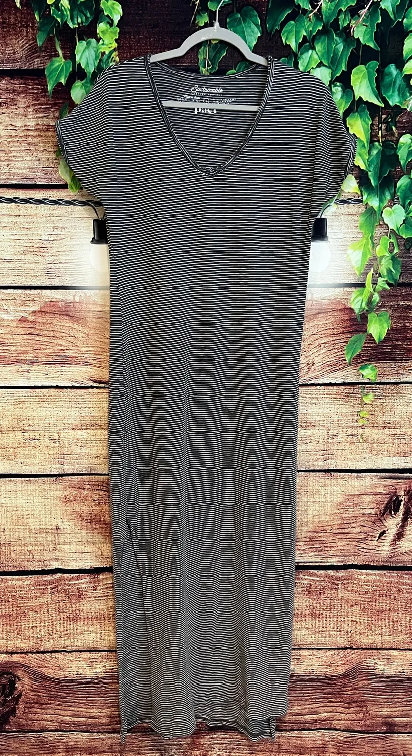 Women's size small PTP = 18" Length = 54" Slit = 20" 100% organic cotton Grey and white striped w... Show more