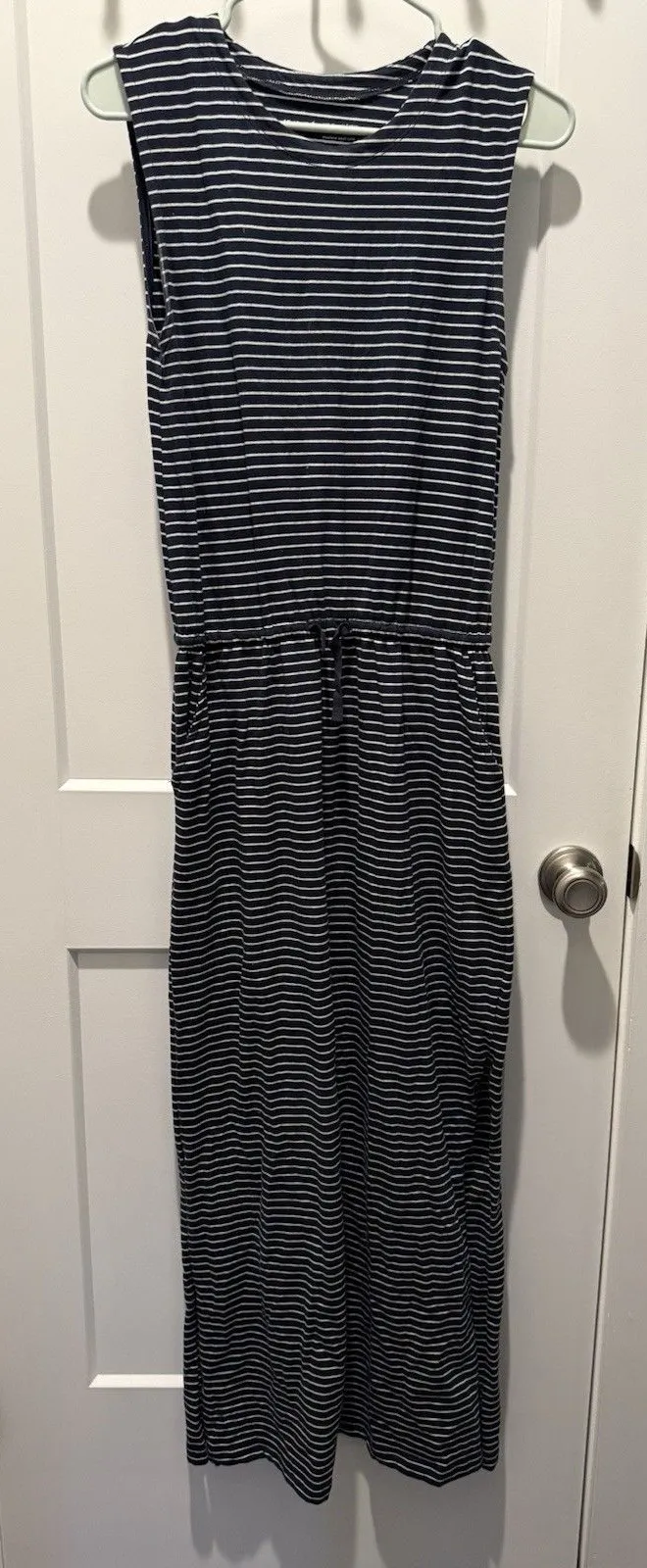 The Pact Organic Cotton Sleeveless Striped Maxi Dress is a stylish and versatile option for a variety of occasions. Made from soft and breathable cotton jersey fabric, this dress features a round neckline, pullover closure, and wide straps for comfort. The blue stripes add a classic touch, while the drawstring waist and pockets add practicality. Perfect for travel, parties, or casual wear, this dress is machine washable and suitable for the summer, fall, and spring seasons. With its maxi length and sleeveless design, it is a chic and easy-to-wear piece for any fashion-forward woman.