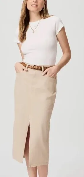PAIGE Angela Midi Denim Skirt Women’s 6 (28) Soft Beige Preppy Classic Casual. This elegant tan midi... Show more