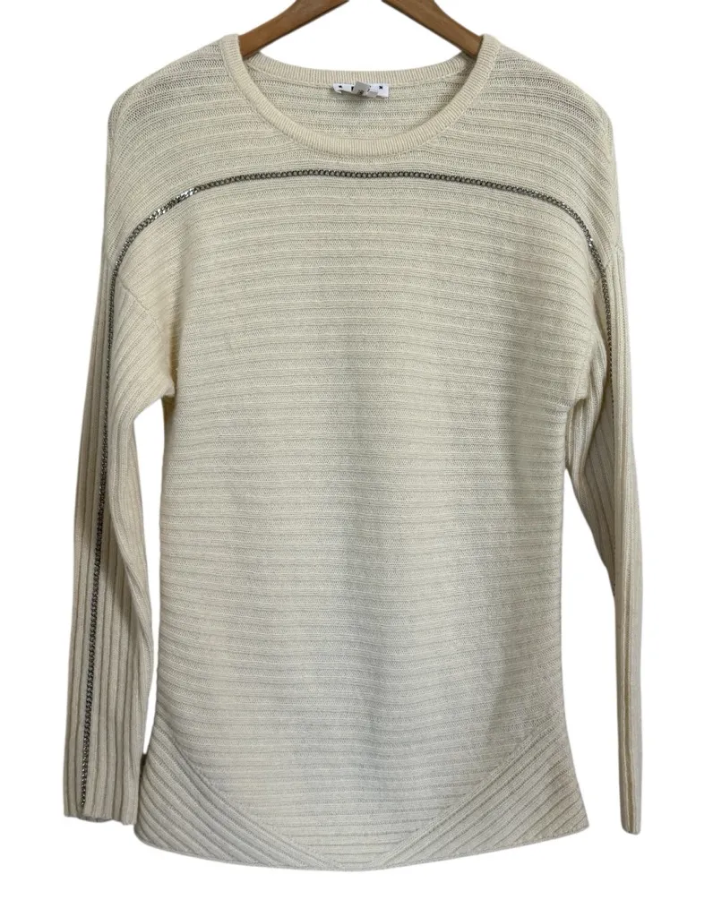 Paige Helena Long Sleeve Sweater in a cream/custard color with silver chain detailing along the shou... Show more