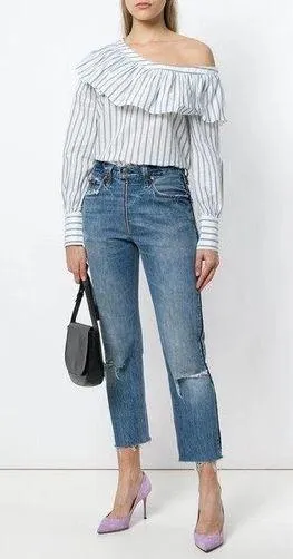 Paige | Halsey one-shoulder ruffle striped poplin blouse in | Papyrus / China Blue | small Neat men... Show more
