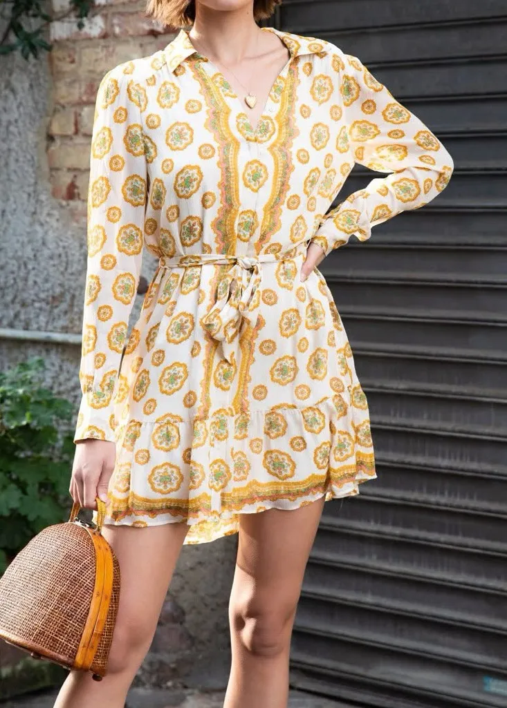 PAIGE Portofino Floral Crinkle Silk Chiffon Shirtdress in Birch Turmeric Size S Cream-colored bac... Show more