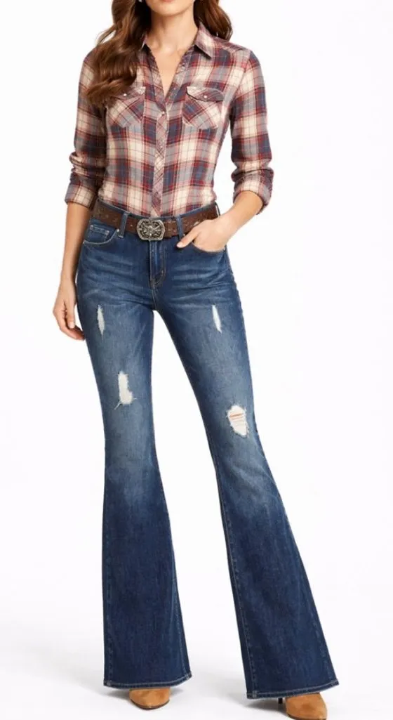 Premium PAIGE Bell Canyon flare jeans in a classic medium-dark wash with intentional distressed deta... Show more