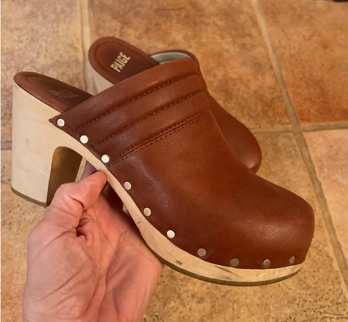 Good used condition These fit true to size Signs of wear only on the toe portion of the wood platf... Show more