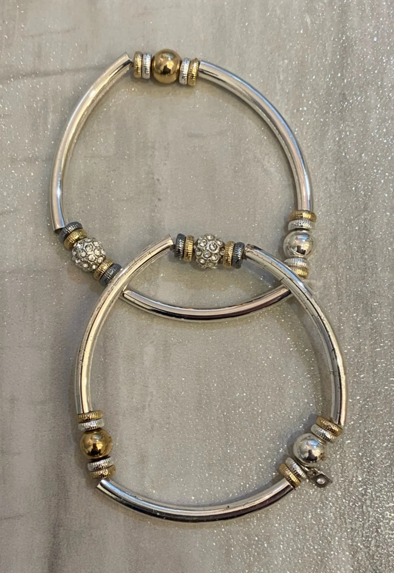 Pair of Nine West bracelets, elastic and one size fits most, silver and gold tone beads, one bracele... Show more