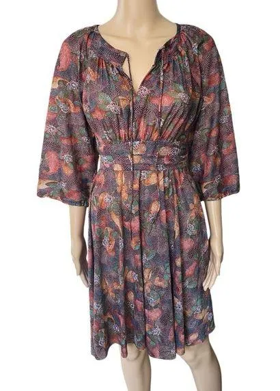 Patty O’Neil Vintage 60s Size 7 Measurements are Approximate Pit to Pit 16” Waist 13” Shoulder to Hem 36” Hippie Boho Eclectic Psychedelic Dot + Floral Prints Semi Opaque Split Neckline with Self Tie 3/4 Bell Sleeves Attached Self Tie Waist Belt Flowy Skirt Zipper Back Closure Mini Length Dress Preowned - minor signs of normal vintage wear no major flaws