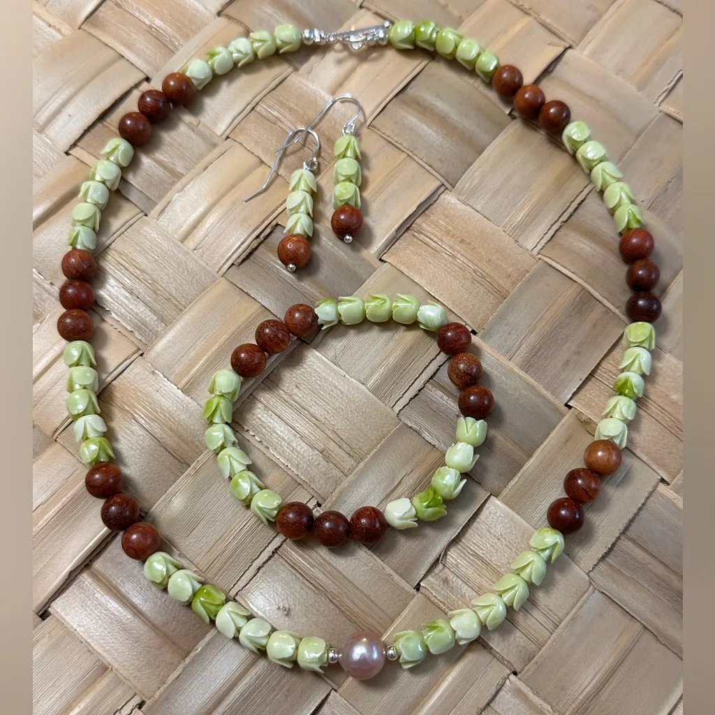 Elevate your accessory game with this stunning beaded jewelry set featuring a necklace, bracelet, and matching earrings. Crafted with vibrant green Pakalana and warm brown Sandalwood beads, this set exudes a natural charm perfect for any occasion. The necklace includes a unique .925 Sterling Silver toggle clasp, ensuring a secure and stylish fit. Each piece is designed for comfort and elegance, making it an ideal gift or a delightful treat for yourself. - Necklace, bracelet, and earrings (choose ONE) included - 10-10.5mm Edison Pearl focal piece - Unique wood bead & shell combination: brown and green - Secure .925 Sterling Silver toggle clasp on the necklace - Lightweight and comfortable for everyday wear - Perfect for dressing up or casual outings