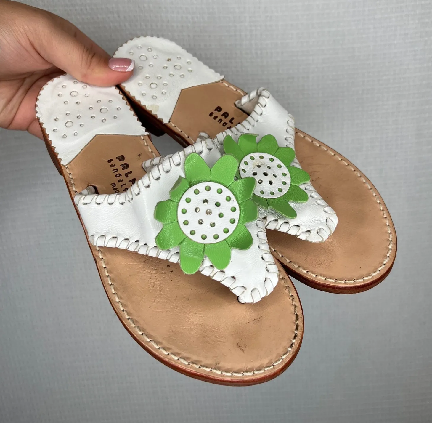 Palm Beach Sandals, featuring a white leather upper and a unique green flower embellishment. These stylish thong sandals are meticulously crafted with attention to detail. The design includes intricate stitching along the edges and a comfortable leather footbed, ensuring both durability and a luxurious feel. The flat silhouette is completed with the brand's logo subtly stamped on the insole. Size Women's 6 Upper Material: Leather Lightweight, Padded, Handmade, Comfort Accents: Scalloped, Logo, Eyelet Character: Flower, Boho, Resort Model: Palm Beach Flower Thong Keywords: Palm Beach Sandals, leather sandals, thong sandals, women's sandals, white sandals, green flower sandals, designer sandals, summer footwear, casual sandals, beach sandals, flat sandals, leather footwear
