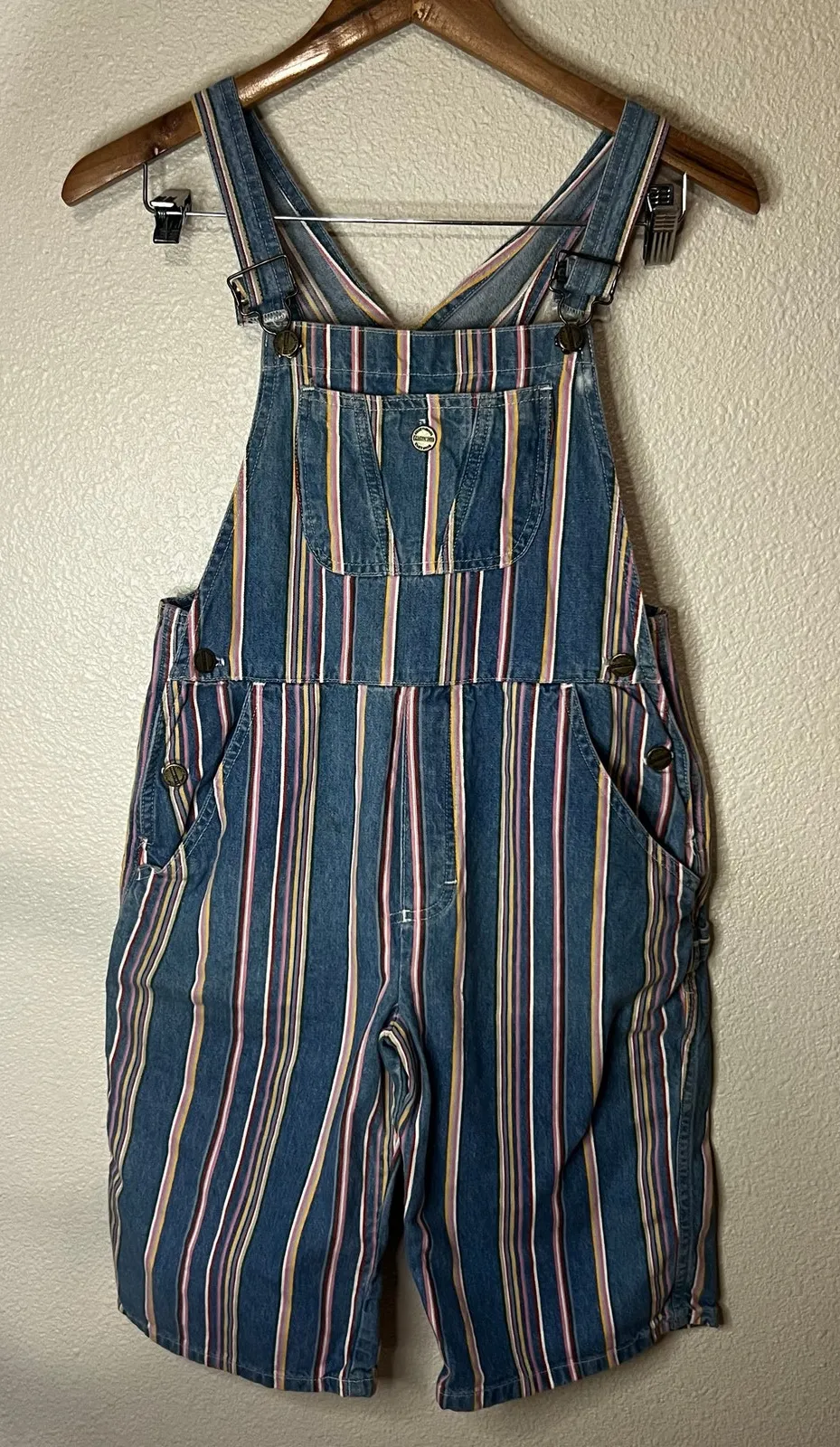 Adjustable straps Vertical colorful stripes 100% cotton Pockets Estimated modern size women’s XS Approximate measurements while laid flat Waist: 15.5” Hips: 19.5” Rise: 11” Inseam: 11.5” Great used vintage condition