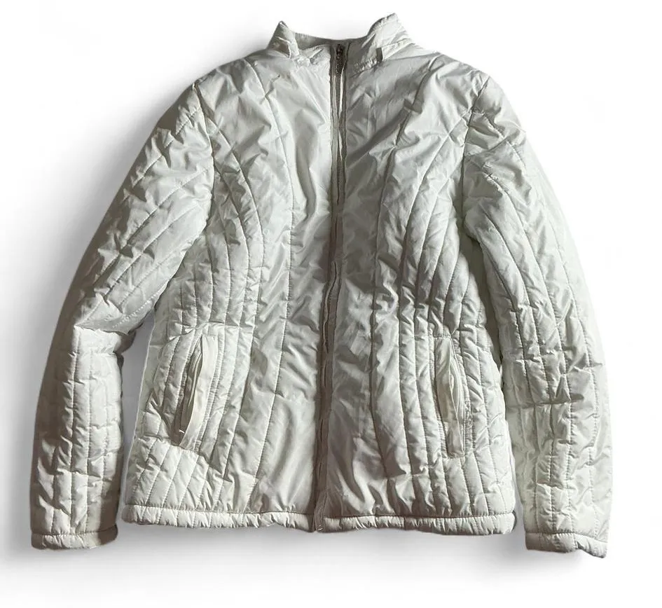 A chic white quilted zip-up jacket from Palomores Fashions Of Calif By George Palomores. This stylish piece offers a flattering silhouette with subtle seaming details and a stand-up collar for added flair. It features two convenient front pockets and a full zip closure for easy wear. Perfect for a casual day out or layering for a touch of warmth on a cool evening. Please note flaw might come off with stain removal Keywords: Palomores Fashions, George Palomores, white jacket, quilted jacket, zip up jacket, womens outerwear, lightweight jacket, casual wear, layering piece, spring fashion, fall fashion All clothing are cross posted, #Quilted #Cozy #Contemporary #Fall