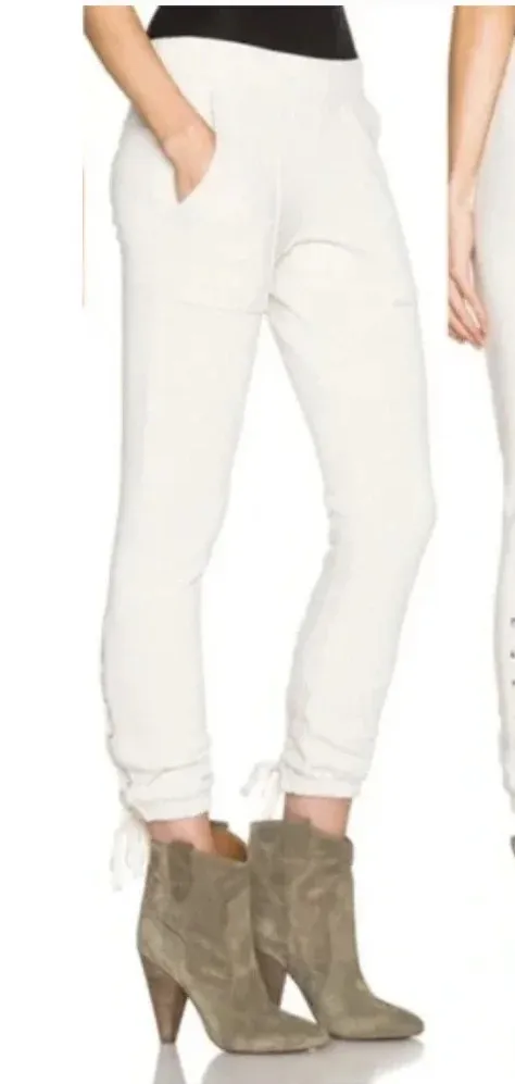 Pam & Gela Lace-up Sweatpants in Oatmeal Features front Hip pockets Elastic waistband, pull-on style Lace-up detail at back ankle 100% cotton Size Small Waist is approx 14.5" Front rise is approx 9" Inseam is approx 26"