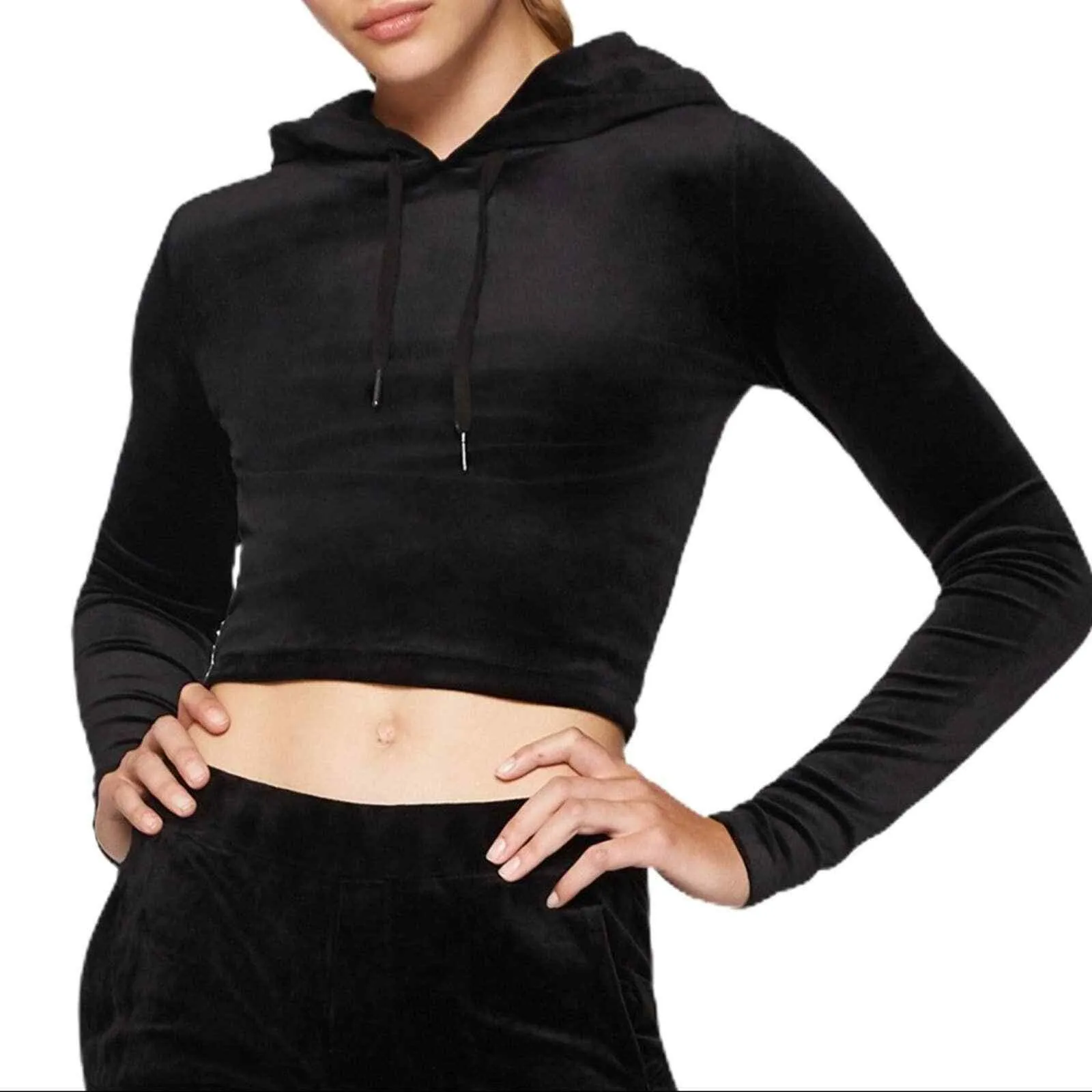 Elevate your every day style with this drawstring hood and stretchy velvet fabric cropped top. Poly blend. Hand wash cold. Attached drawstring hood. Imported. Brand new with tags. Armpit to armpit 16” Length 17”
