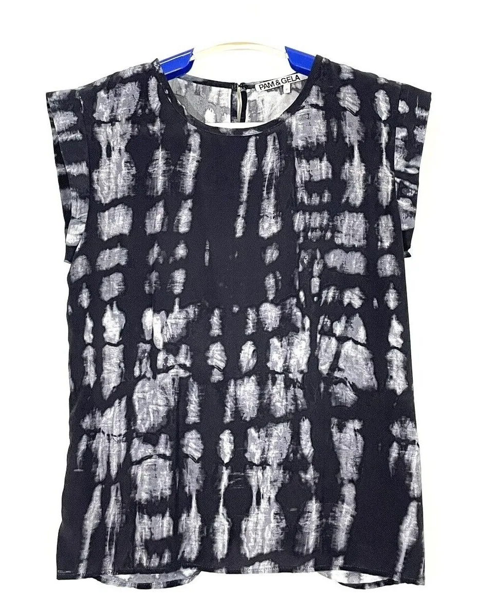 Pam & Gela Black Silk Tie Dye Sleeveless Open Back Top Blouse. Open back with twist hem, hook & eye closure. Size P / XS Measurements on last photo. Approximate measurements taken with garment laying flat. I try to describe my items but I believe that pictures tell a more accurate description of the item and its condition. Measurements, fabric content labels, size tags and care labels are usually shown on the pictures. If for some reason, you are unable to see them clearly or are missing, feel free to message me and I would be more than happy to answer any questions you might have.