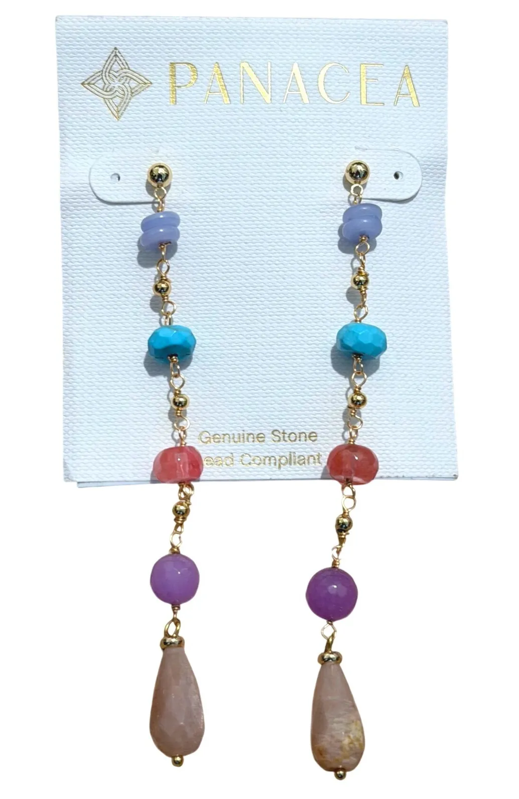 Long dangle earrings featuring a cascade of genuine stones in varying shapes and colors including purple, turquoise, pink, and rose quartz. Each earring is adorned with beads and a teardrop-shaped stone at the bottom, suspended from gold-tone findings. These lead-compliant earrings are perfect for adding a pop of color and bohemian flair to any outfit. brand new!!! Style: Dangle/Drop, Beaded Main Stone Color: Multicolor Main Stone: Quartz Material: Stone Type: Earrings Keywords: PANACEA earrings, genuine stone earrings, dangle earrings, drop earrings, beaded earrings, multi-stone earrings, purple earrings, turquoise earrings, pink earrings, rose quartz earrings, bohemian earrings, handmade earrings, fashion earrings