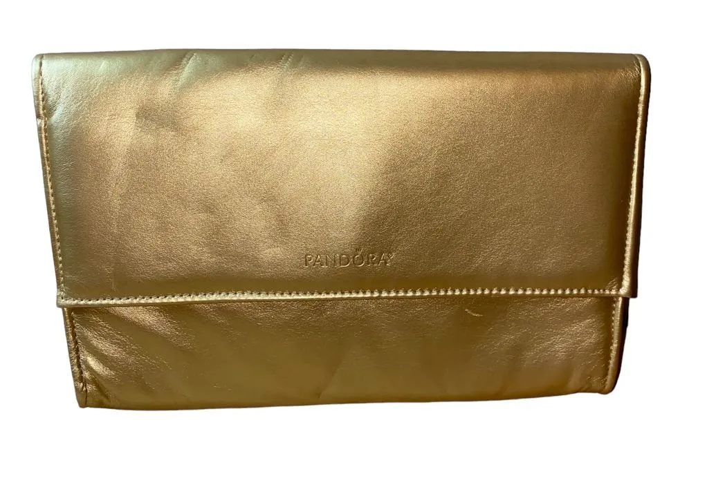 EUC Pandora Gold Fold Over Clutch Purse Button closure Two interior slip pockets Closed: 6.25β X 9... Show more