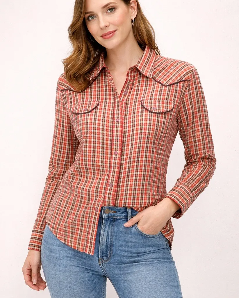 Embrace rustic charm with this eye-catching Panhandle Slim western shirt. The vibrant plaid pattern in shades of red, cream, and brown creates a timeless look, while subtle metallic threads woven throughout add a touch of sparkle and shine. Distinctive western-style yokes on the front and back, along with pearlized snap closures, offer authentic cowboy flair. This versatile top is perfect for a day at the ranch, a country music concert, or a casual weekend outing. Measurements: • Bust: 42 in • Waist: 34 in • Length: 25 in • Sleeve Length: 24 in Type: Button-Up Department: Women Style: Basic Material: Cotton, Polyester Blend, Spandex Neckline: Collared Sleeve Length: Long Sleeve Sleeve Type: Classic/Fitted Sleeve Pattern: Plaid Accents: Button, Glitter Theme: Cowboy Features: Stretch Fit: Slim Fabric Type: Woven Occasion: Casual, Workwear Closure: Button Keywords: western wear, plaid shirt, snap front, cowgirl style, country chic, metallic threads, embroidered yokes, long sleeve, button up, ranch wear, rodeo ready, festival fashion, smart casual
