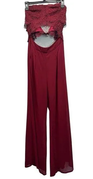 Burgundy Maroon Lace Top Bare Midriff Open Back Jumpsuit. Bandeau type lined top with crocheted lace... Show more