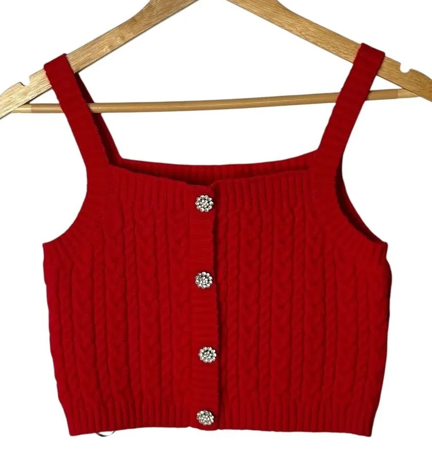 All orders shipped next business day. Papaya Red Cable Knit Crop Top Jeweled Button Sleeveless Tank... Show more