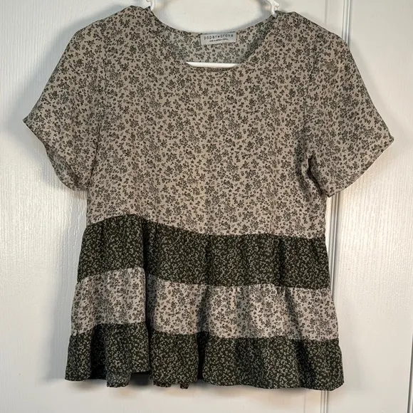 Paper Crane Olive Green Tan Floral Pepulm S/S Blouse Size XS EUC #5848 - $18 - From Vir