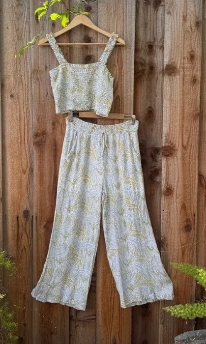 This set features a chic crop top and comfortable wide-leg pants in a lovely white, gray, and yellow... Show more