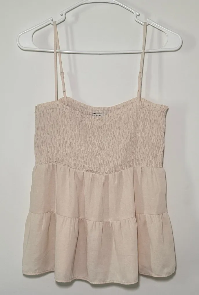 Paper Crane Women’s Beige Smocked Tiered Cami Top Adjustable Straps Flowy Lightweight Size Large Gr... Show more