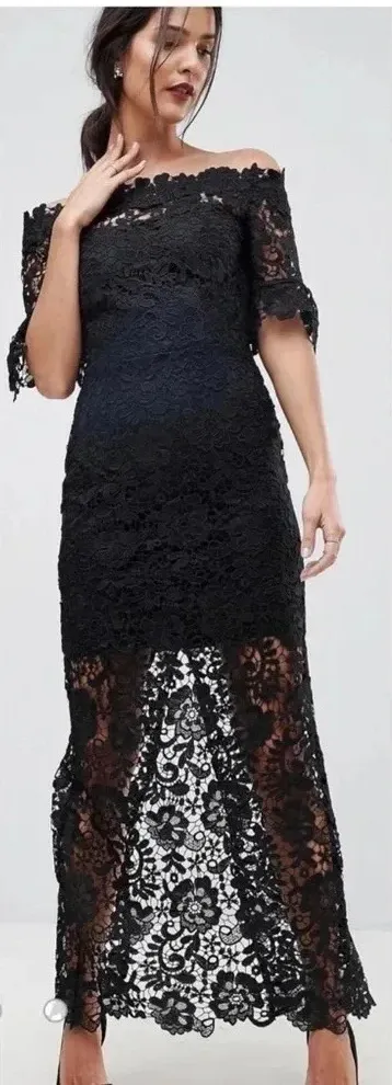 EUC. Black. Zips in the back. Off the shoulder. Partially lined. Slit up back hem. Polyester. Size US 6. Pit to pit: 17.5” Pit to hem: 48” Waist flat across: 14.5” Back slit: 24” Smoke free. Prom Gala Party Wedding Coctail dress