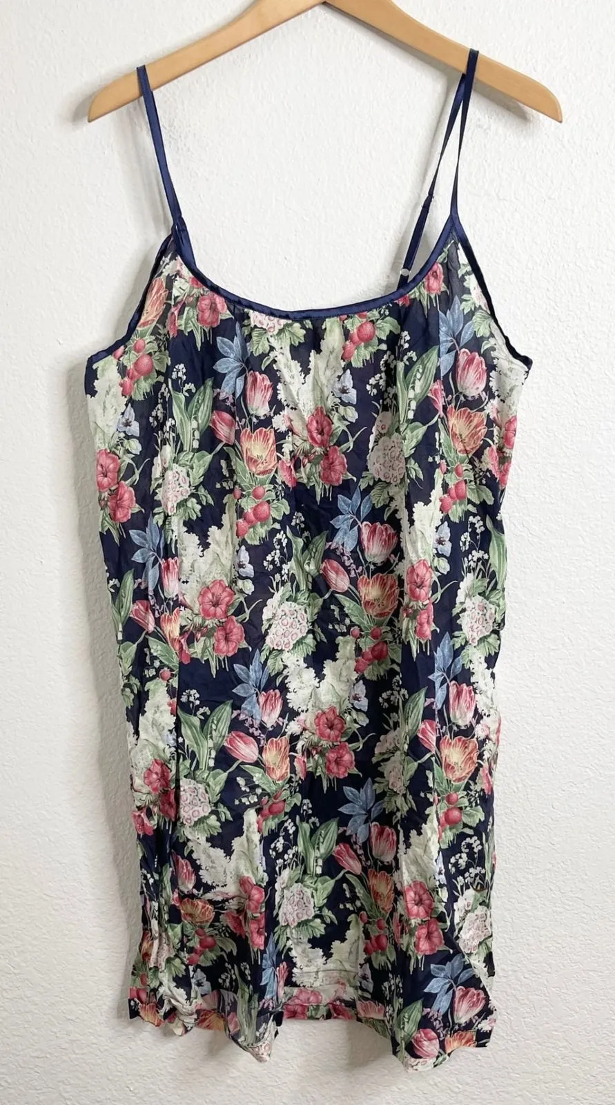 Papinelle cotton nightgown slip dress in a beautiful navy blue floral print featuring shades of pink and white. Delicate navy trim adorns the neckline and spaghetti straps, adding a touch of elegance. Perfect for lounging at home or as a comfortable sleepwear option. Size Large Approximate measurements follow Chest- 19" Length- 39" Good preowned condition Keywords: Papinelle, nightgown, slip dress, floral print, cotton, sleepwear, loungewear, feminine, delicate, comfortable, spring, summer