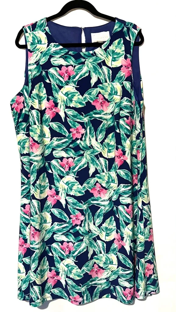 Size: 2X Color: Navy, Green, Pink Material: 95% Polyester, 5% Elastane Condition: Excellent Used Condition This Pappagallo floral print sleeveless sheath dress brings effortless style with bold, beautiful colors and a comfortable, stretchy fit. Made from wrinkle-free fabric, it's perfect for travel and resort wear. The easy slip-on design with a stylish keyhole back makes it a versatile and low-maintenance piece for warm weather outings. Measurements (in inches): • Shoulder to Shoulder: 15" • Armpit to Armpit: 24" • Waist: 50" • Hip: 54" • Length: 40" Ships in 1-2 Business Days! Make me an offer!