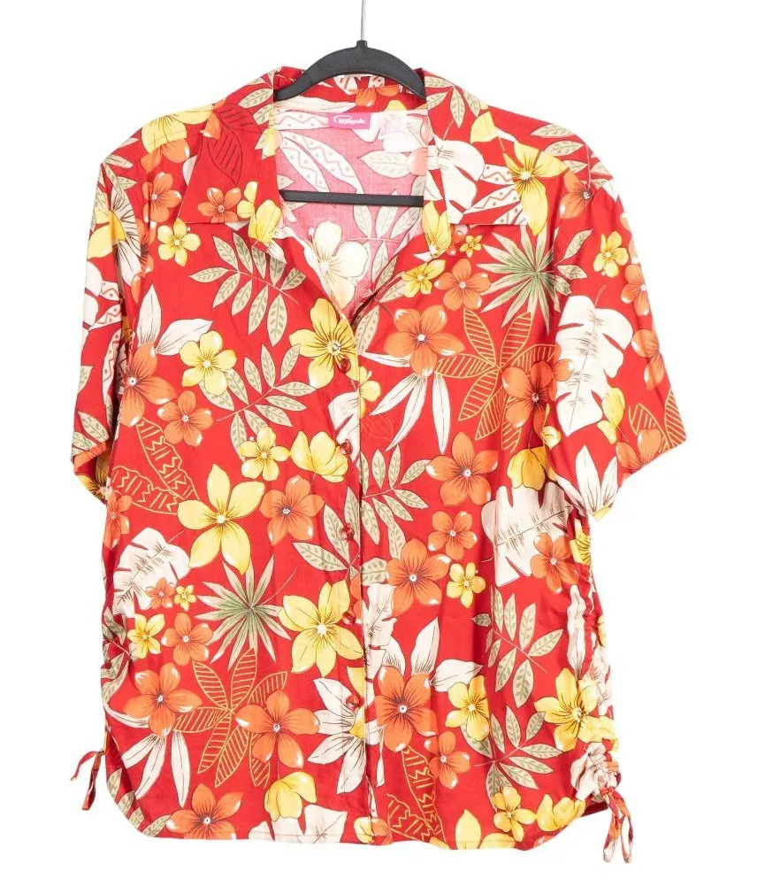 Size: Womens XL Measurements are approximate and taken flat. Underarm to Underarm 23 in / 58 cm Sleeve Length 9 in / 23 cm Top Length 27 in / 69 cm There are no stains, tears, or rips. Please see the pictures. All pictures are of the actual item. Colors may vary slightly due to camera limitations and monitor settings. • 55% Cotton, 45% Rayon • Machine Wash Pre-Owned Good