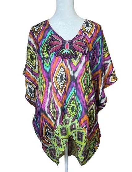 PARADIZIA pullover swim cover-up or kaftan/poncho style tunic top White Lotus style!! One size Excellent condition Hi-low handkerchief style hemline Stunning bright and colorful Sequin artsy floral design at neckline Lightweight and silky material No fabric content tag or care tag beyond what is pictured Beautiful to slip on for the beach or pool, or wear it as a summery resort wear style top Truly a unique piece - can’t find another one like it! Eurosummer Vacation Amalfi coast Quiet luxury Fairy Hippie Approximate measurements: Pit to pit: 30” Length from shoulder to side hemline: 32” Ships fast from CLEAN, smoke-free home!! BIN 1