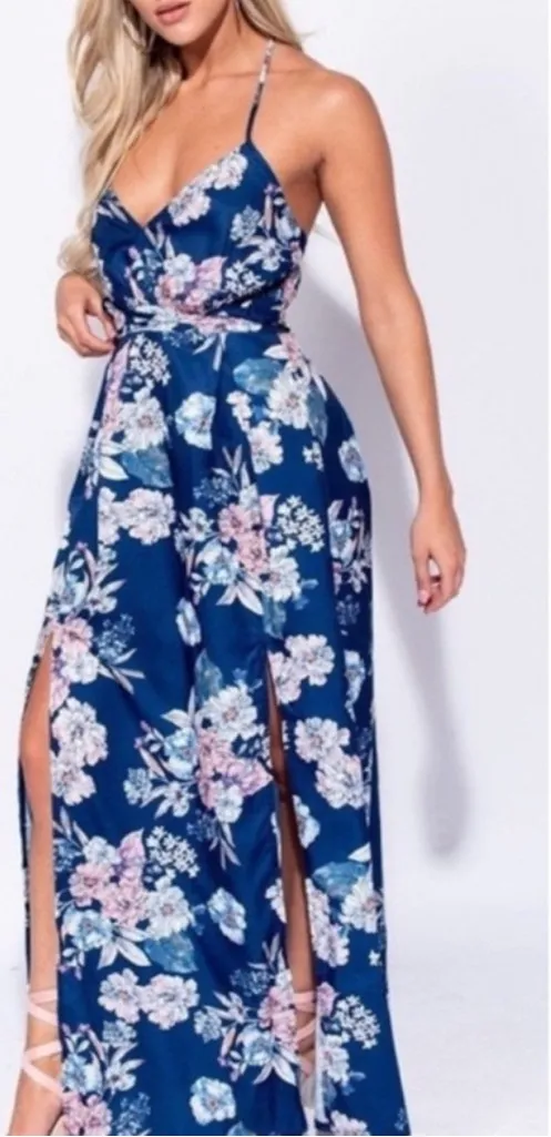 Embrace a romantic flair with this Parisian Works sundress, showcasing a pink and blue floral design. The sleeveless spaghetti strap neckline and high side slit add a touch of elegance, making it ideal for a wedding guest or cocktail event. Its flowing silhouette and empire waist offer a sophisticated and graceful look.