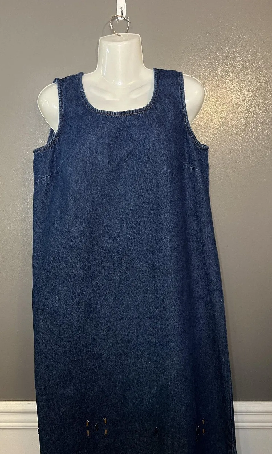 Gently worn. Fabric clean and intact with bead embellishments secure at hem. No flaws, original hang tags not included. Brand: Parsley & Sage Style: Womens sleeveless tank dress in a blue denim maxi length silhouette. Color: Blue Size on tag: Large (Regular) Material: 100% cotton denim; unlined woven fabric. Neckline: Scoop neck with wide tank-style shoulder straps. Design details: Pullover style, straight relaxed fit, side hem vents, decorative beaded and stitched embellishments around the lower skirt and hem. Origin and care: Made in India. RN 90312. Hand wash separately in cold water, line dry in shade. Features: Scoop neckline, sleeveless tank straps, long maxi length, side slits at hem, embellished beaded hem detail, casual denim style suitable for spring and summer wear. PTP 21" Length 50" bin 92 2468