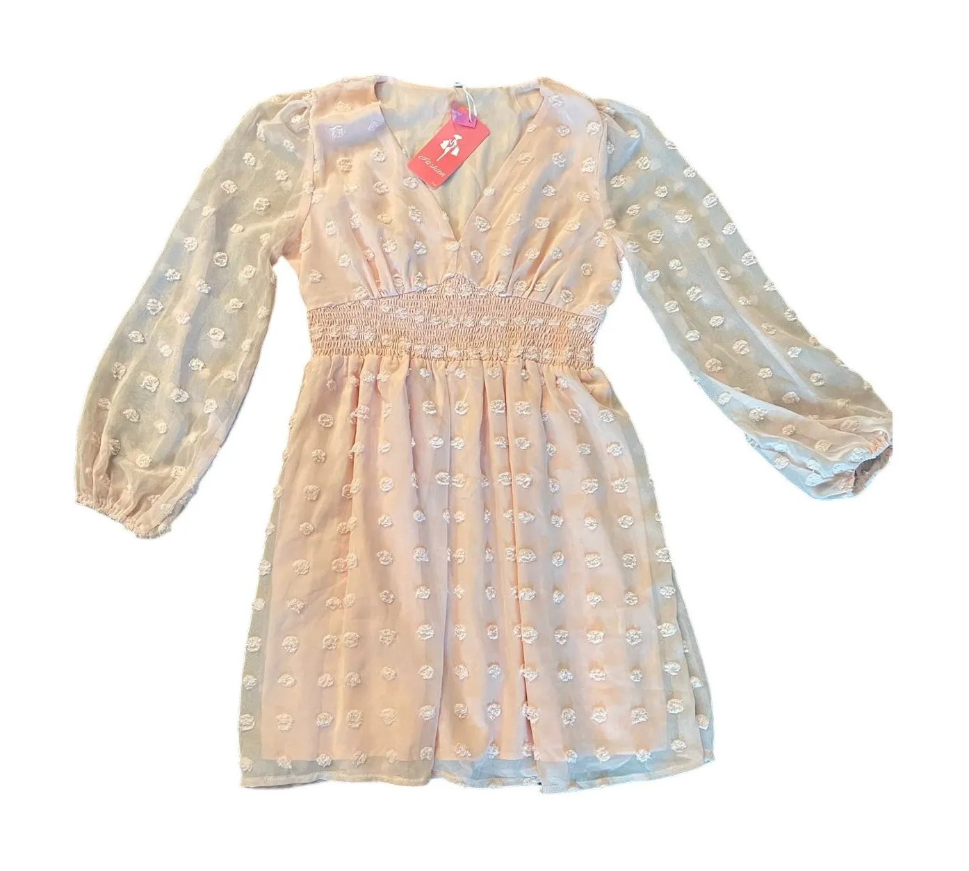 New with tags - perfect condition Sheer overlay with attached Pom Pom detailing - sheer detailed long sleeves with smocked waist line for extra stretch. Pastel Pink Smocked Waist Pom Pom Long Sleeve Dress Size Large Measurements - laid flat: Bust: 39 inches Waist: 30 inches - super stretch waistline not used in measurement Length: 34 inches