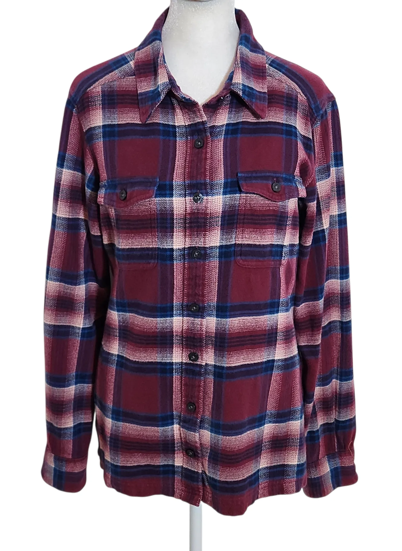 Patagonia comfortable plaid flannel shirt in shades of blue and burgundy with two chest pockets and... Show more