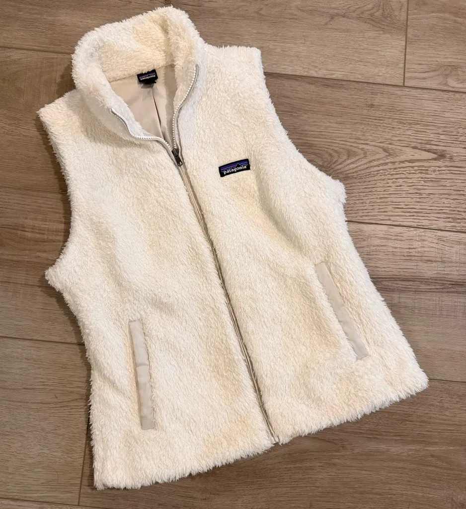Soft cream fleece vest by Patagonia. Features zip closure and side pockets.