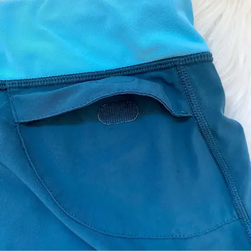 Patagonia running shorts with two tones of blue. Elastic waist with a polyester brief liner in black... Show more