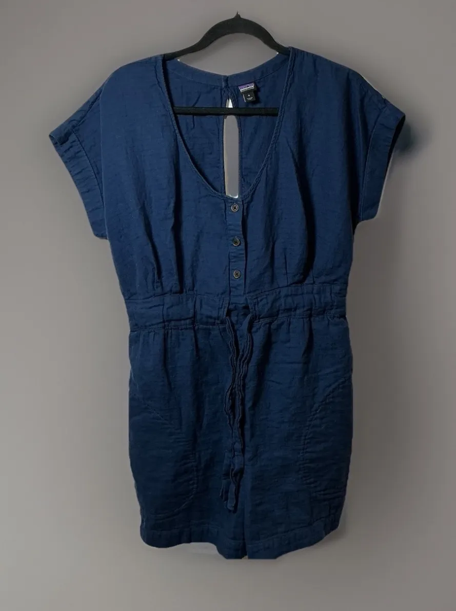 Keywords: Patagonia dress, organic cotton dress, blue dress, women's dress, casual dress, tie waist dress, button front dress, V-neck dress, summer dress, beach dress, vacation dress, size small dress, Patagonia clothing, eco friendly fashion