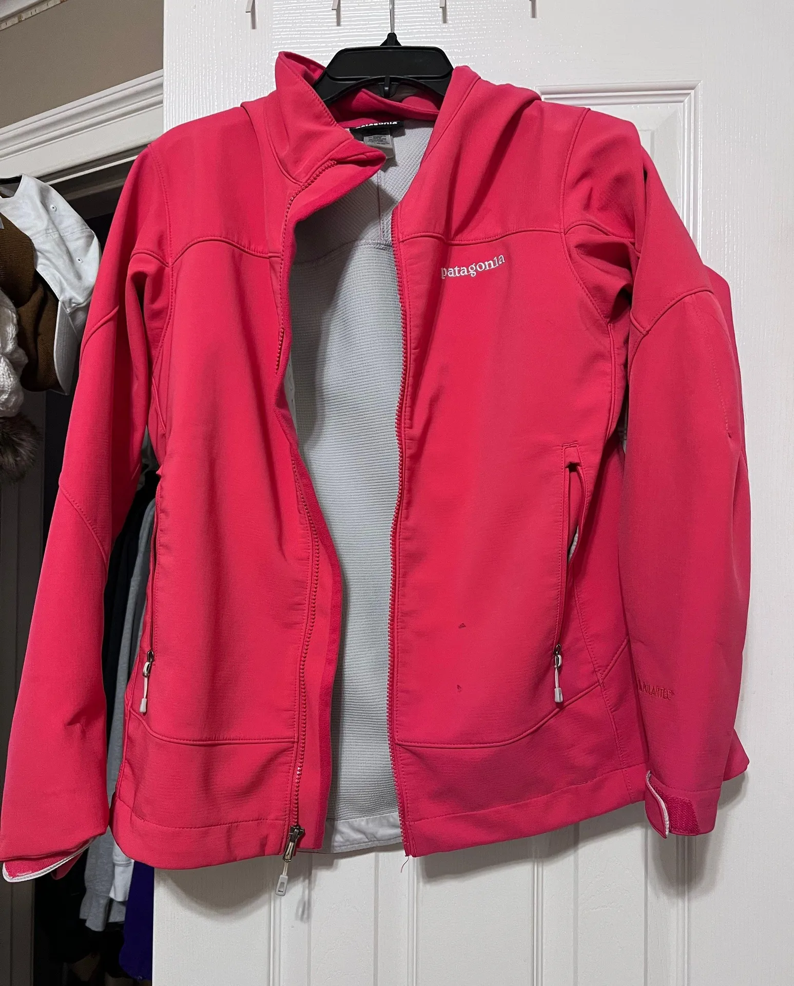 Size: L | Color: Coral-ish Pink | Patagonia Raincoat | Super cute! Has two weird little dots, but ot... Show more