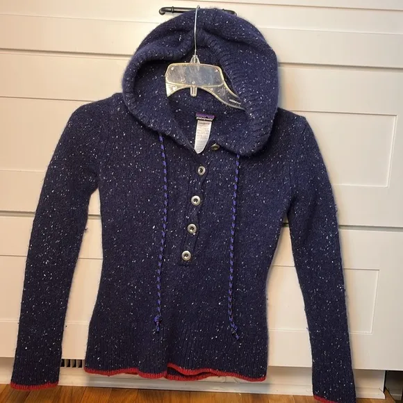 Patagonia Women’s Ranchito Hoodie Size S Navy blue color with white flecks, red contrast knit at hem... Show more