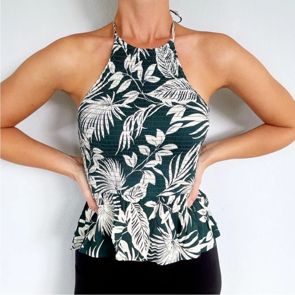 This stylish Patrons of Peace halter top features a tropical fern print in green and white. Designed with a smocked bodice for a flattering fit and a flouncy peplum hem for a feminine touch. Made of soft, lightweight 100% rayon — perfect for warm-weather days. • Size: Large • Color: Green and White • Style: Smocked halter peplum top • Fabric: 100% Rayon (exclusive of elastic) • Adjustable tie at neck • New with tags • Made in India Condition: New with tags 5 star seller! Will ship same or next day (except for weekends) Bundle to save! SEO Tags: Patrons Of Peace top, green halter blouse, tropical print top, summer peplum top, smocked halter tank, resort wear, beach top, boho blouse women large