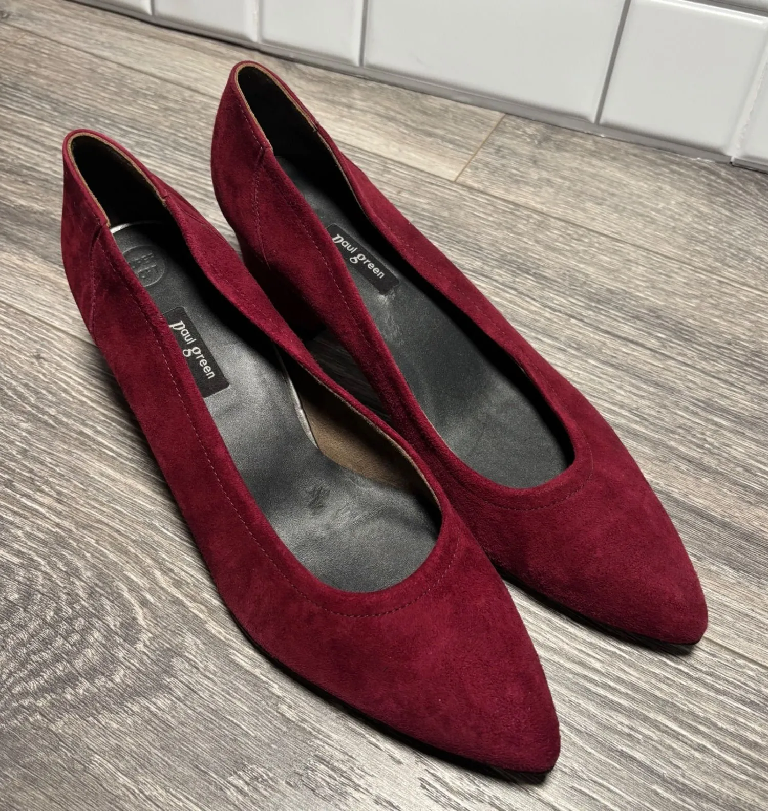Elegant block heel pumps in a rich burgundy suede. These stylish shoes feature a pointed toe and a comfortable block heel, making them perfect for both dressing up and professional settings. A sophisticated footwear choice that adds a touch of color and class to any outfit. These shoes are suitable for work events, dinner dates, and casual outings where you want to elevate your look. Paul Green Burgundy Suede 2" heel Foam-cushioned footbed with arch support Leather upper and lining/synthetic sole Made in Austria Like new condition Keywords: Paul Green, Burgundy Pumps, Suede Heels, Pointed Toe Shoes, Block Heel Pumps, Dress Shoes, Womens Shoes, Size 7.5, Red Heels, Career Wear, Office Shoes, Casual Elegant, Comfortable Heels, Stylish Pumps