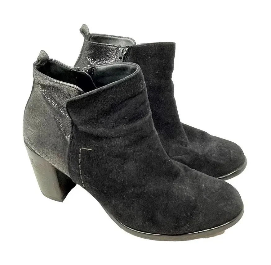 Paul Green Rockin Booties A rich suede front meets a shiny, lightly crackled back to shape a rockin' boot set on a chunky stacked heel 3 1/4" heel 3 3/4" boot shaft. Side zip closure. Leather upper and lining/synthetic sole. Size 7 = US 9.5