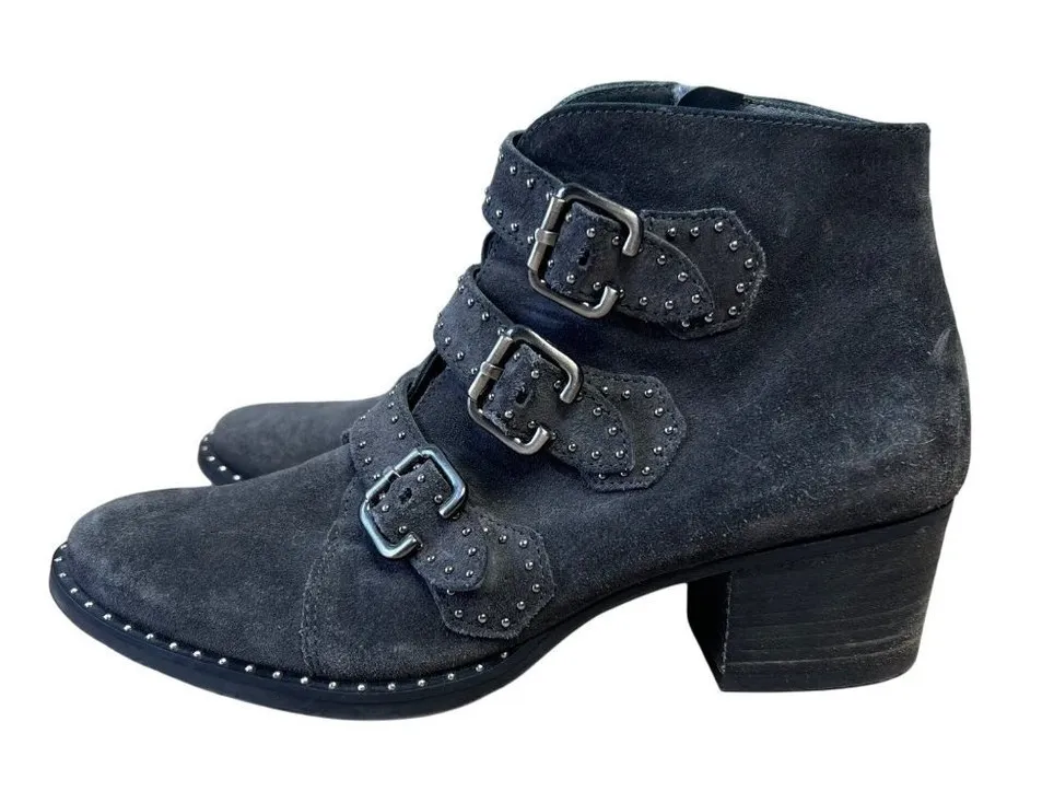 Pointed toe with micro stud edging Micro Studded straps Triple strap with silver tone buckle adjustment size 4 UK = size 6.5 US casual, contemporary, fashion, glam, streetwear, goth, dark, moto, Soho, statement, unique, designer, dressy, going out, emo Size: Womens 6.5 Condition: Pre-Owned great condition - no flaws