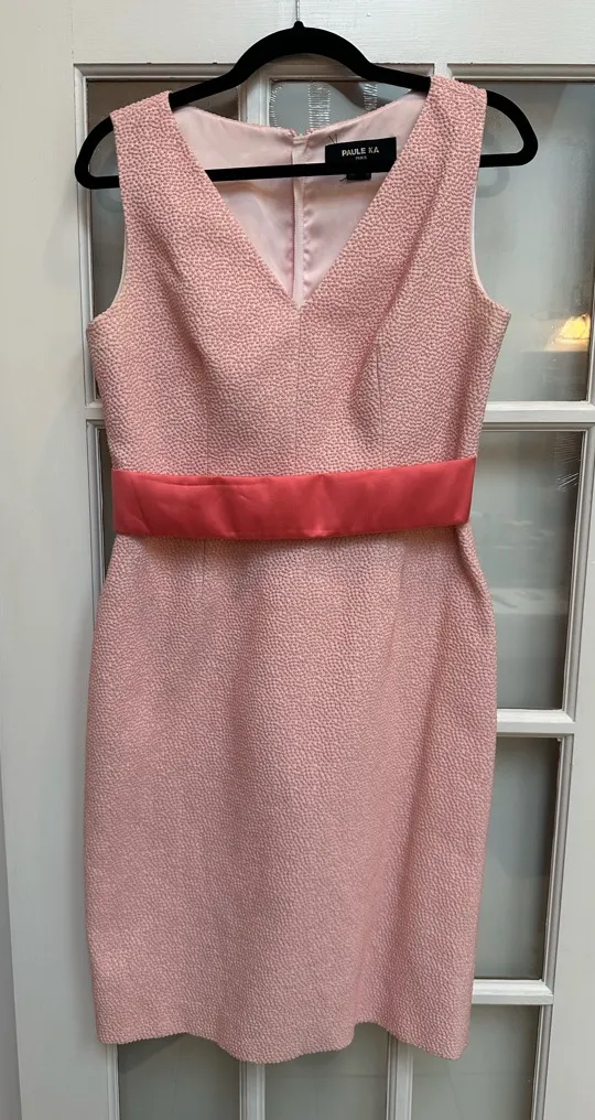 Elegant blush midi dress featuring a striking coral belt. Sleeveless and sophisticated. Good, preowned condition, no rips holes or snags Some minor discoloration in the armpits, see 2nd photo, very minimal and not noticeable. Dress was just professionally cleaned Smoke free home