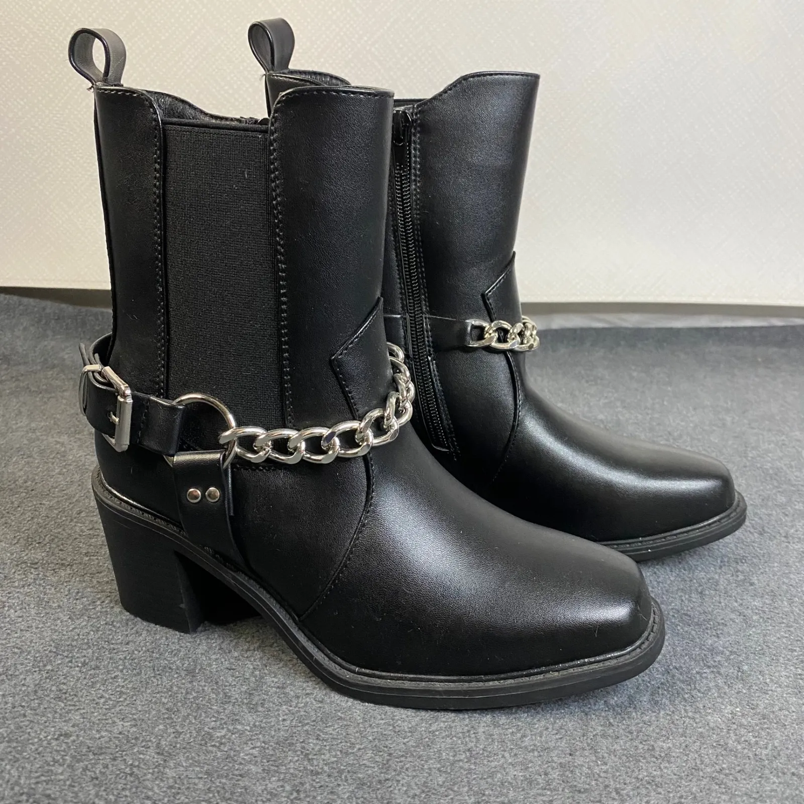 Command attention with these edgy Pazzle ankle boots, a fusion of classic style and modern flair. These striking black booties feature a sleek silhouette, enhanced by a bold chain accent that wraps around the ankle, adding a touch of rebellious charm. The sturdy block heel provides both height and stability, making them perfect for all-day wear. A side zipper ensures easy on and off, while the elastic goring offers a comfortable, flexible fit. These boots are ideal for adding an urban edge to your everyday outfits, or for making a statement at a casual night out with friends. Size: 7.5 Condition: New without Tags Style: Bootie Color: Black Department: Women Upper Material: Faux Leather Shoe Shaft Style: Ankle Heel Style: Block Lining Material: Synthetic Insole Material: Synthetic Outsole Material: Rubber Occasion: Casual, Party/Cocktail Toe Shape: Square Toe Heel Height: Mid (2-2.9 in) Type: Boot A189