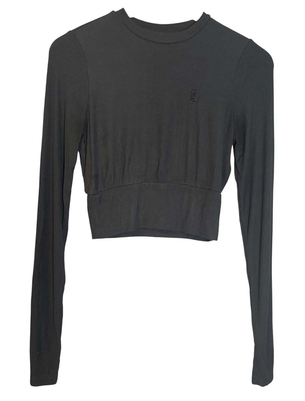 Size medium Excellent preowned condition - no flaws 16.5" pit to pit 16.5" length Show off sporty style in a long sleeve cropped T shirt cut from soft rib with stay put thumb hole cuffs. Crewneck 92% viscose 8% elastane